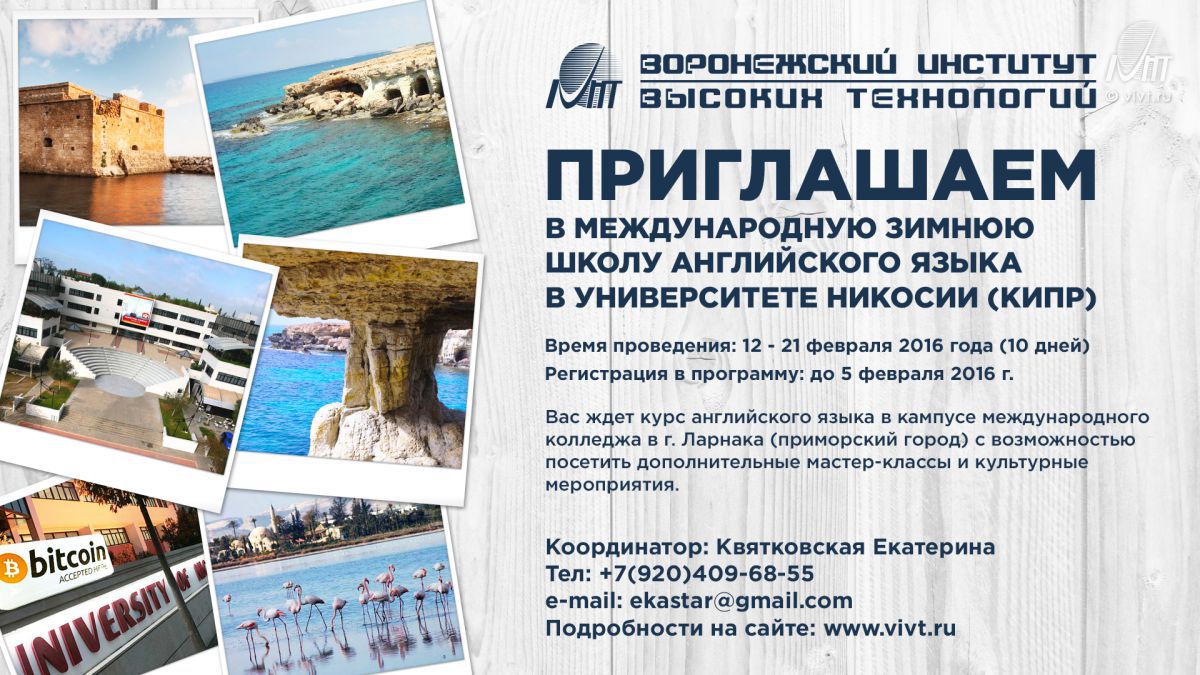 Приглашаем Вас в Международную зимнюю школу английского языка в Университете Никосии (Кипр) с 12 по 21 февраля 2016 года (10 дней).Международная Зимняя Языковая Школа в Университете Никосии предлагает курс английского языка для учебных целей (по уровням) в кампусе международного колледжа в г. Ларнака (приморский город) с возможностью посетить дополнительные культурные мероприятия и мастер-классами, специально разработанные для программы Зимней школы.
